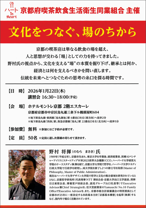 京都府喫茶飲食生活衛生同業組合では、京都の喫茶店が持つ「場のちから」をテーマに、哲学研究者・経営者として京都市総合計画審議会特別委員をはじめ国内外で幅広く活動されている野村将揮氏を迎えて講習会を開催されます。