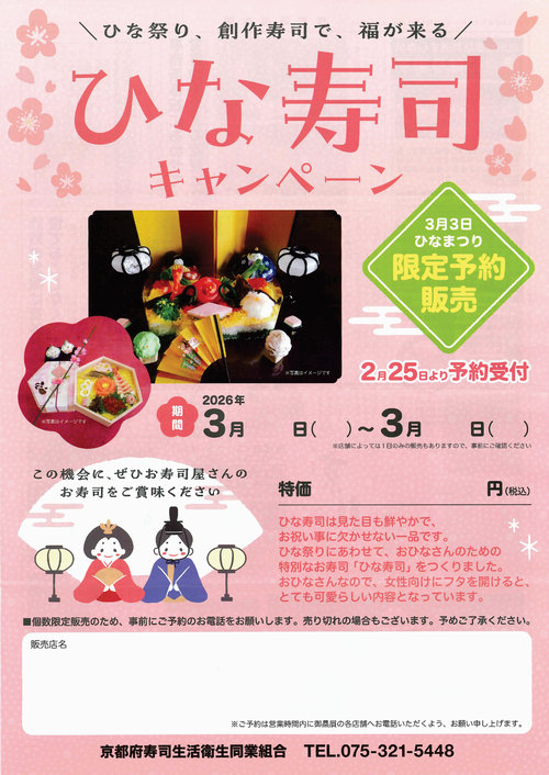 3月3日は桃の節句。京都府寿司生活衛生同業組合では「ひな寿司」の限定予約販売が行われています。