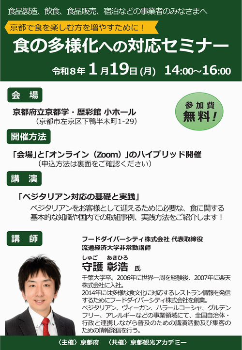 京都府では、飲食店・宿泊施設・食品事業者向けに、多様な食ニーズへの対応力を高めるセミナーを開催されます。
