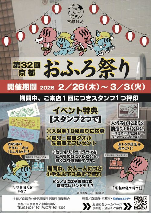 期間中、スタンプを2つ集めると、先着順で京都銭湯公式キャラクター「湯鬼・湯狐」タオルをプレゼント。また、抽選で100名様に入浴券10枚綴りが当たる応募企画があります。